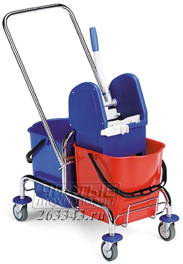 Тележка уборочная имеет металлическую хромированную раму с прорезиненными колёсами, укомплектована двумя ведрами по 15 или 25 литров. Удобная перекидная металлическая рукоятка. В комплектацию также входит механический отжим, рассчитанный для выжимания как плоских так и смесовых (веревочных) мопов.