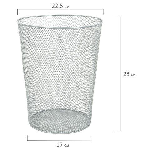 Изготовлена из металлической сетки серебристого цвета. Корпус расширяется к верху: диаметр основания составляет 17 см, а диаметр верхней части -22,5 см. Высота - 28 см, объем - 9 л. Легкость и компактность корзины позволяют перемещать её с одного места на другое. Корзина удобно помещается под рабочим столом.